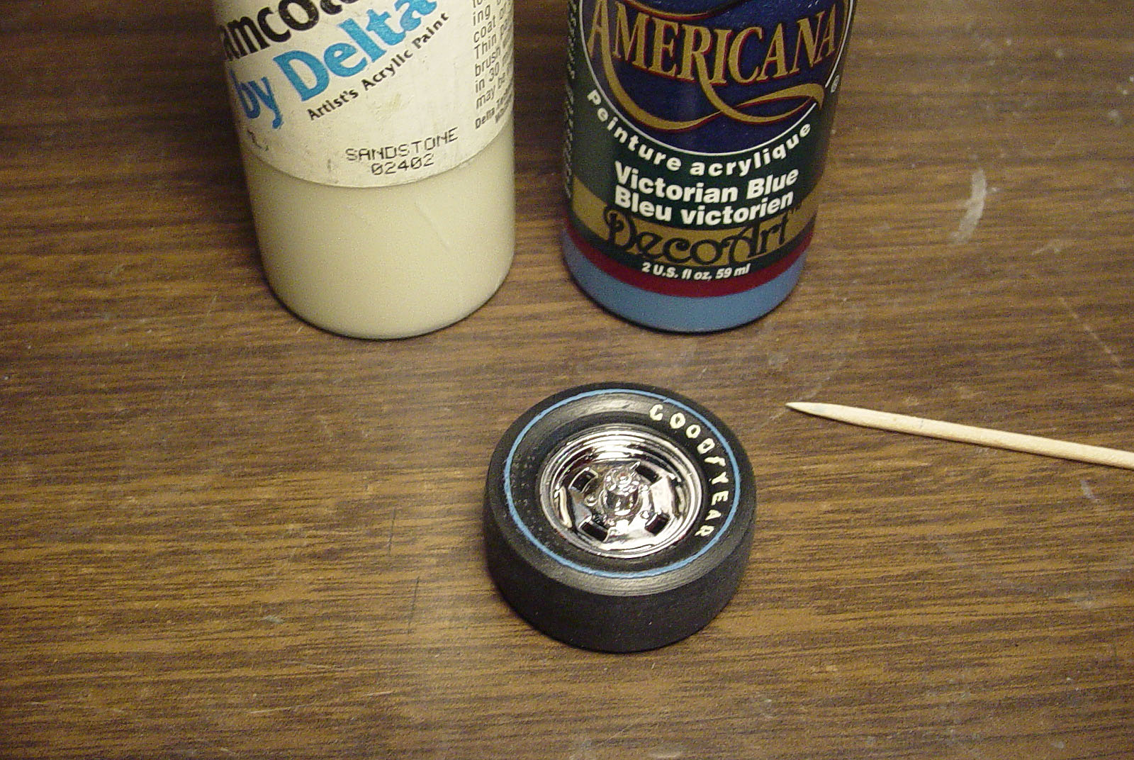 To letter or stripe tires: Use a tooth pick and acrylic craft paint.