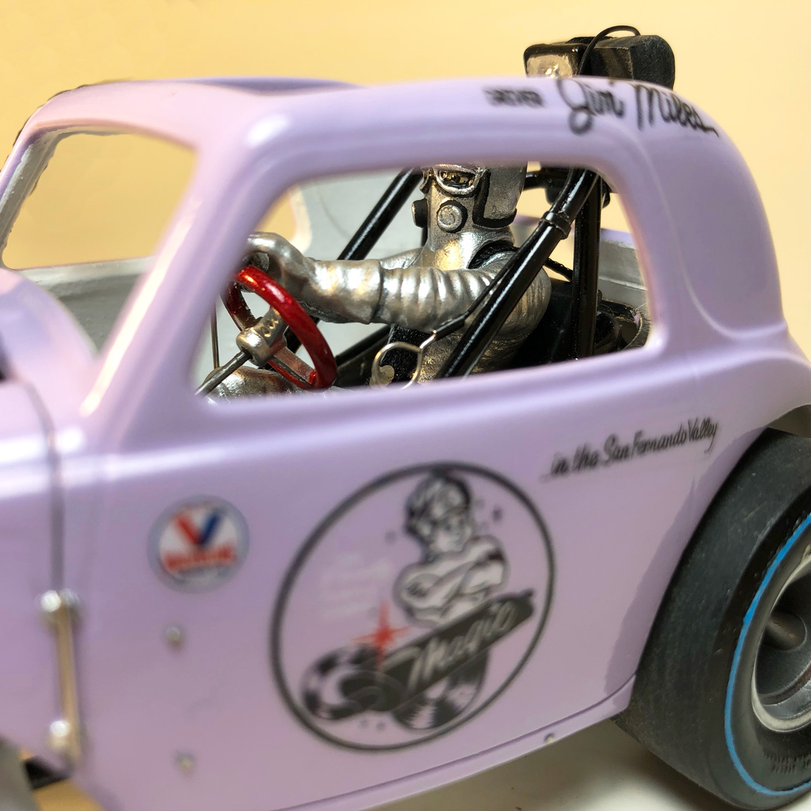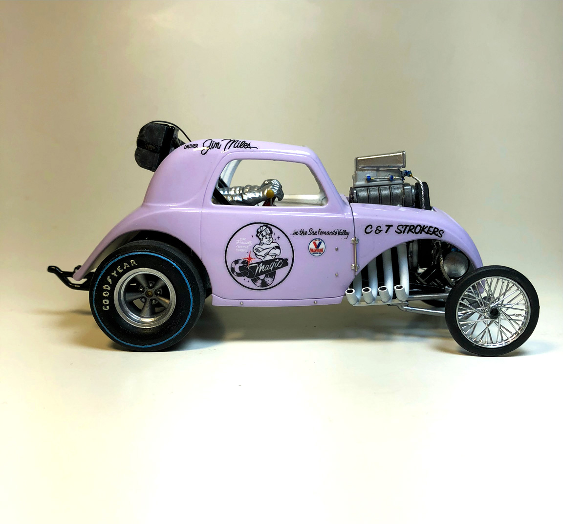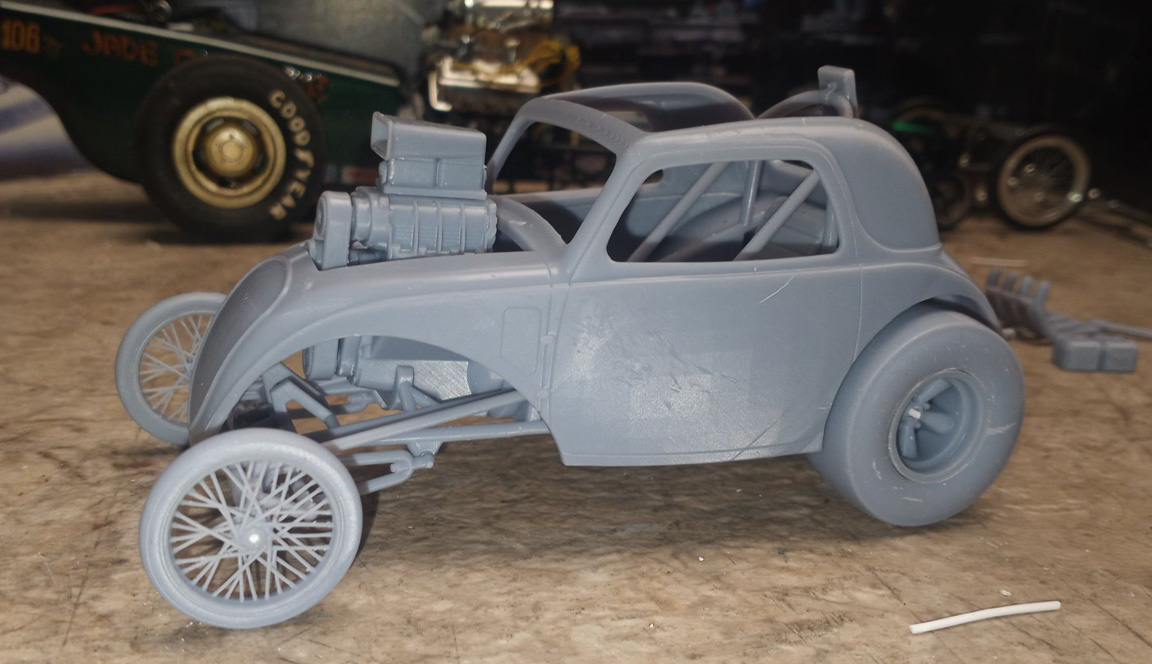 Slicks were swapped out, headers from MPC Malco Mustang Gasser were cut separately and flipped around.
