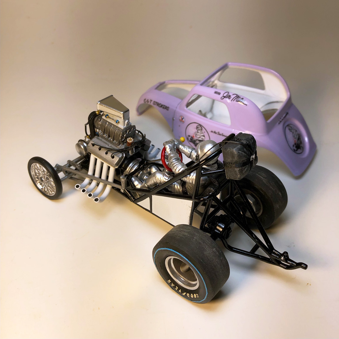 Scratch built features: Firewall, front frame clip, Hemi Hilborn Injection Manifold