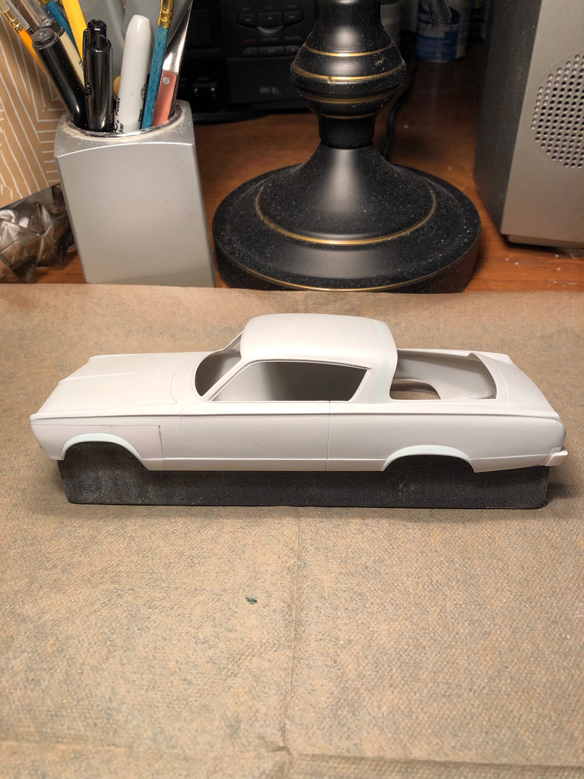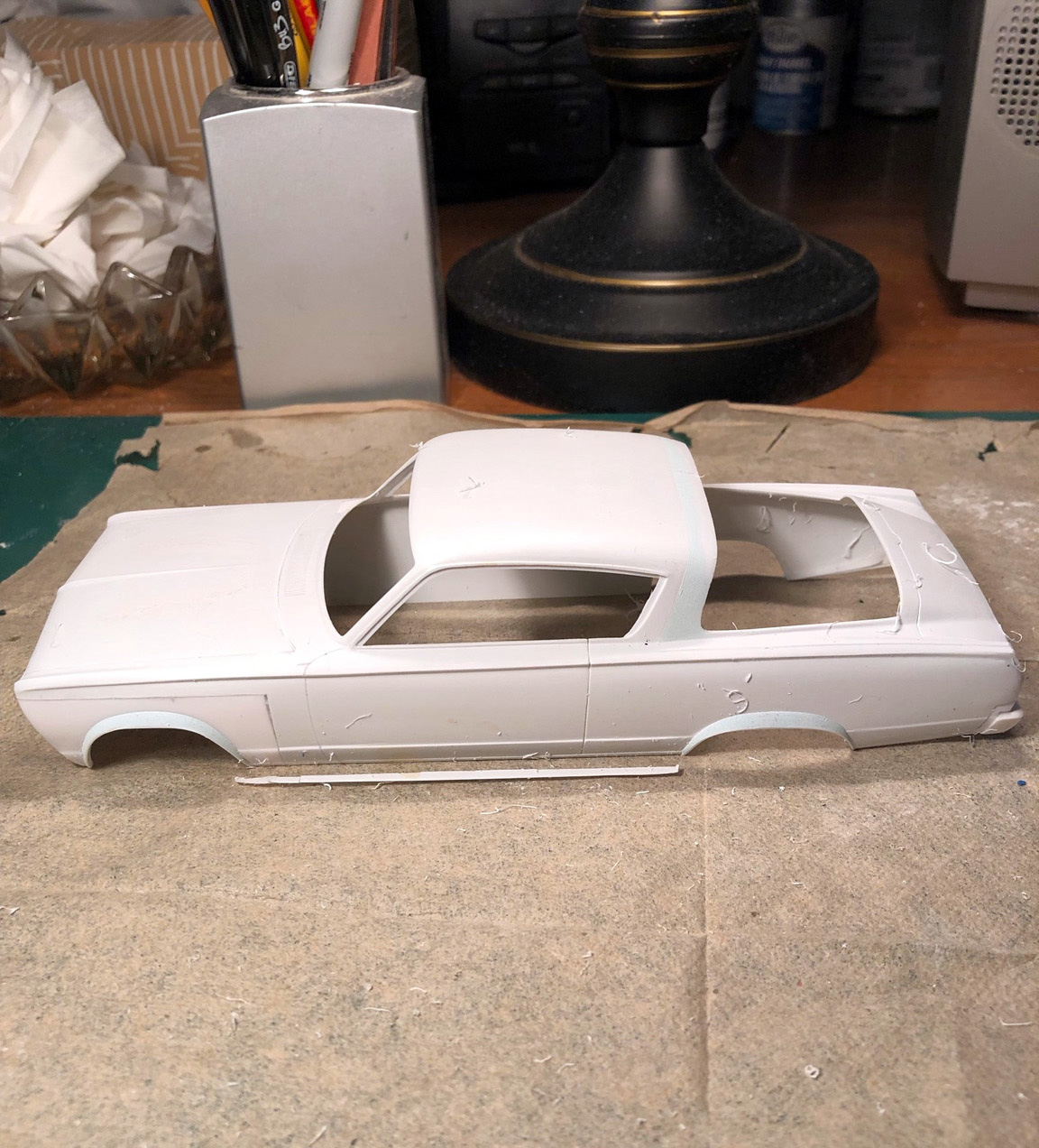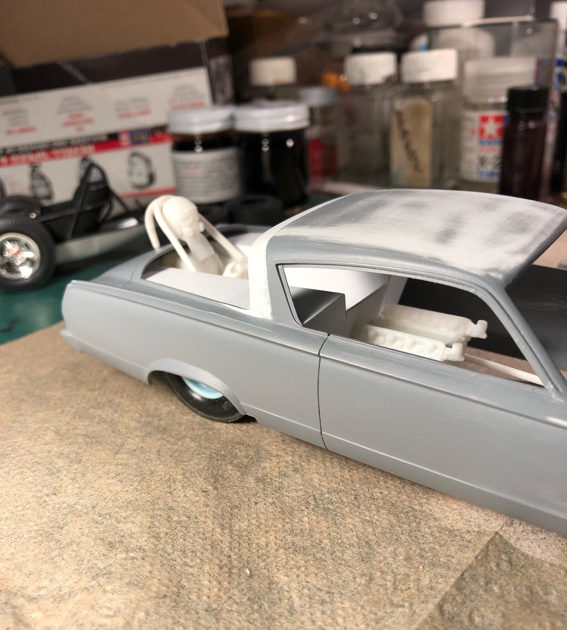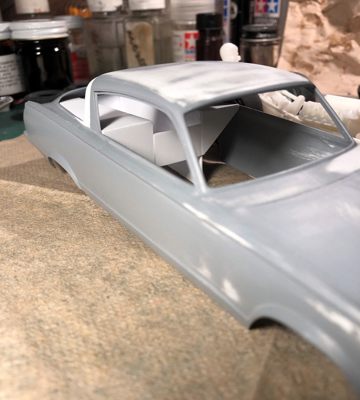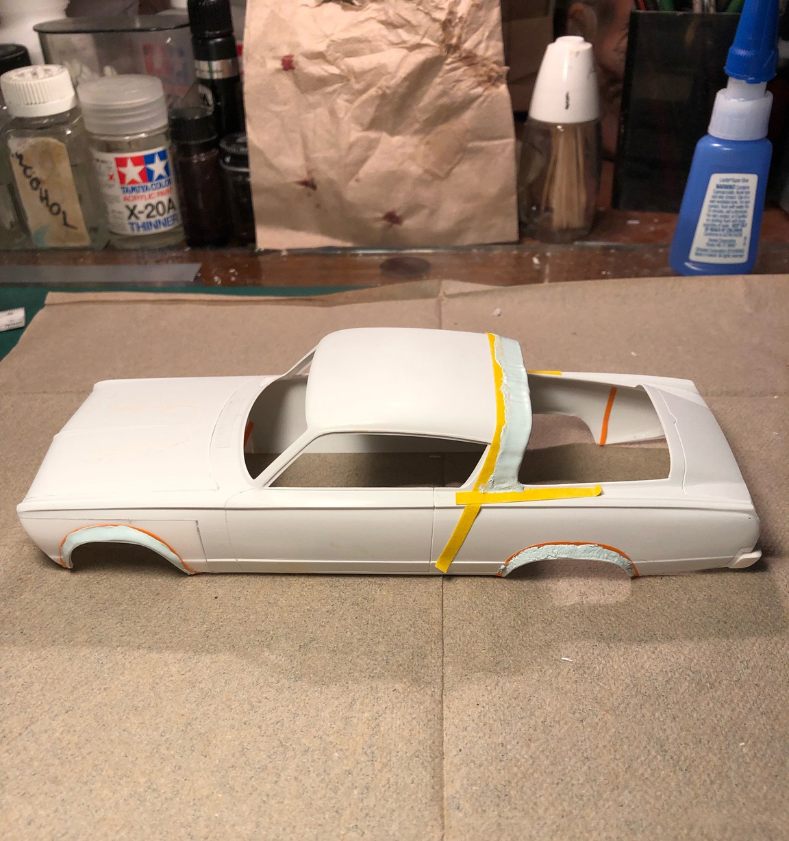 The roof and sail panel are also taped off in yellow tape and putty was applied to all.
