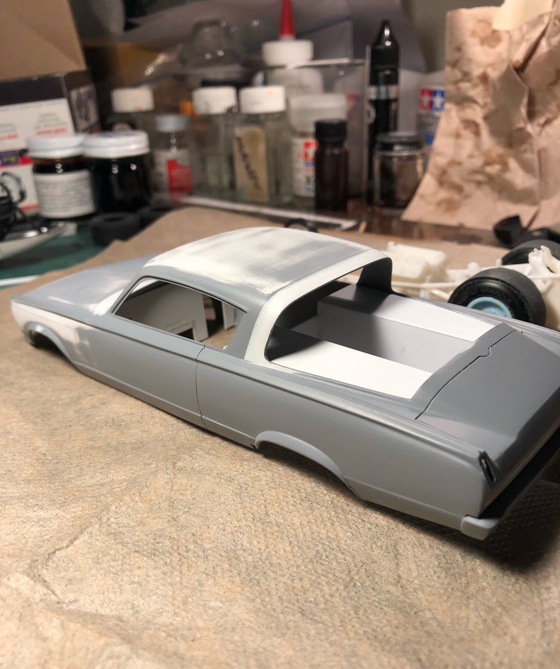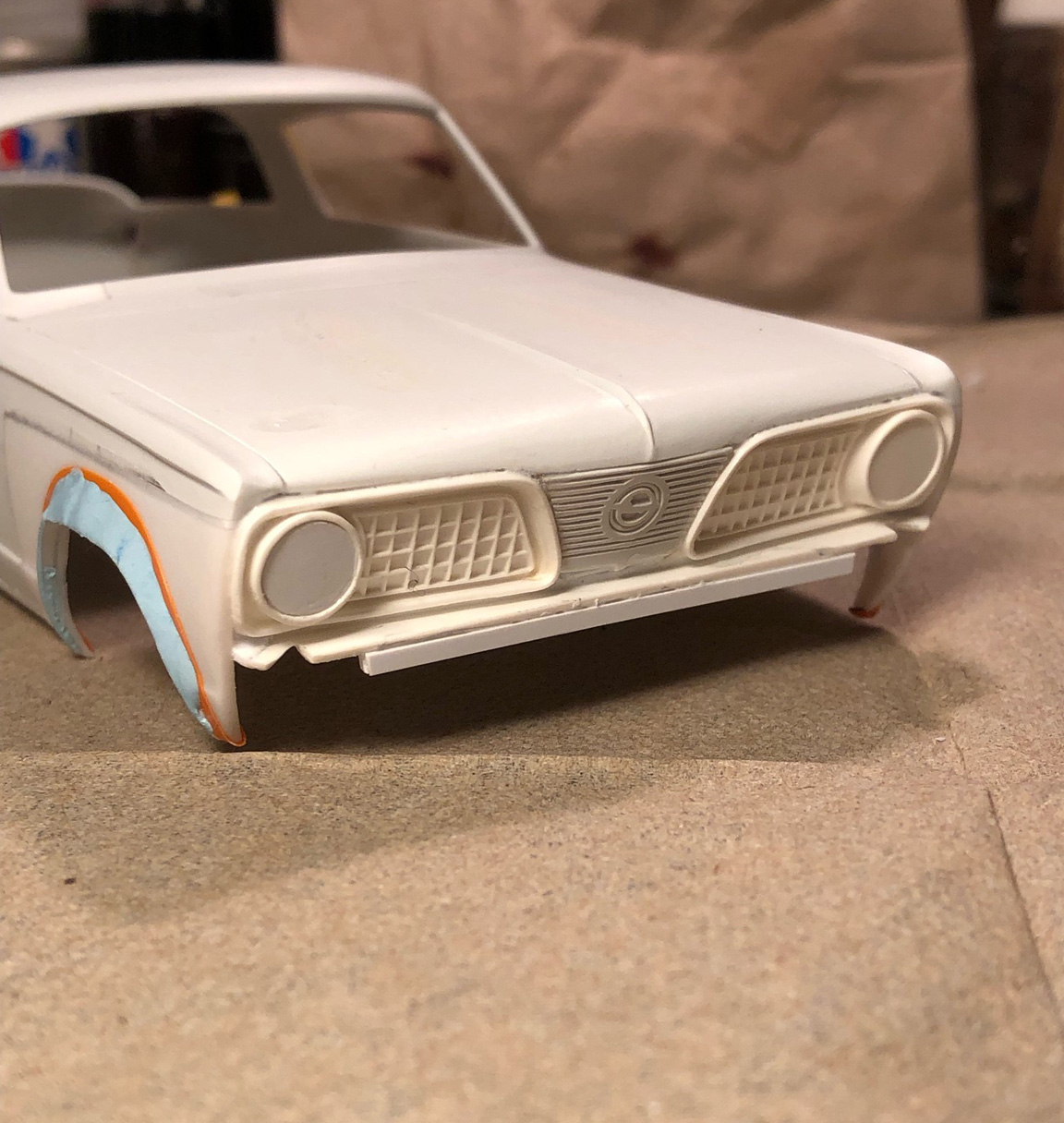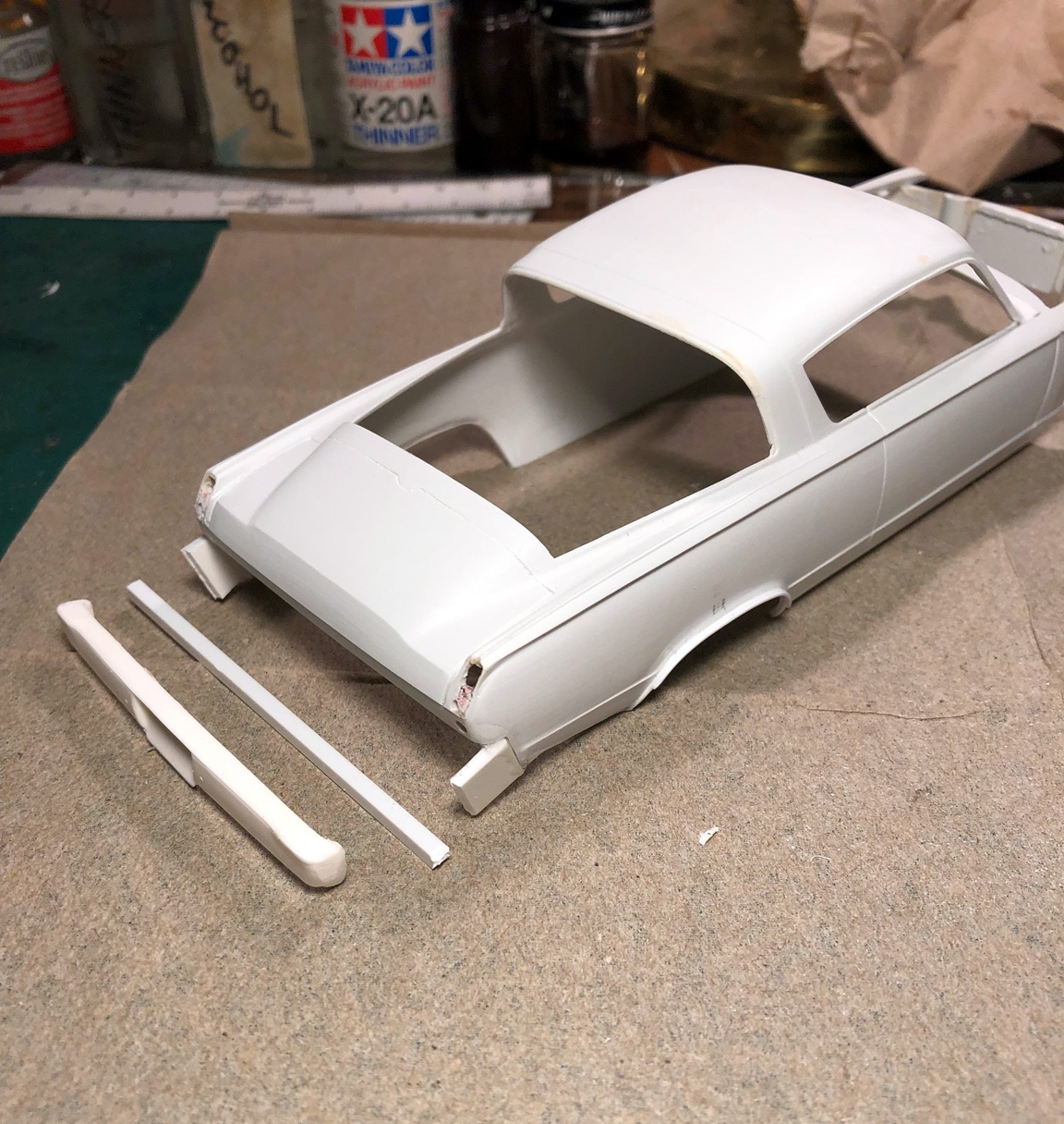 The rear bumper needed to be lowered by 2 scale inches and pushed out 2 scale inches and was filled in with sheet plastic.