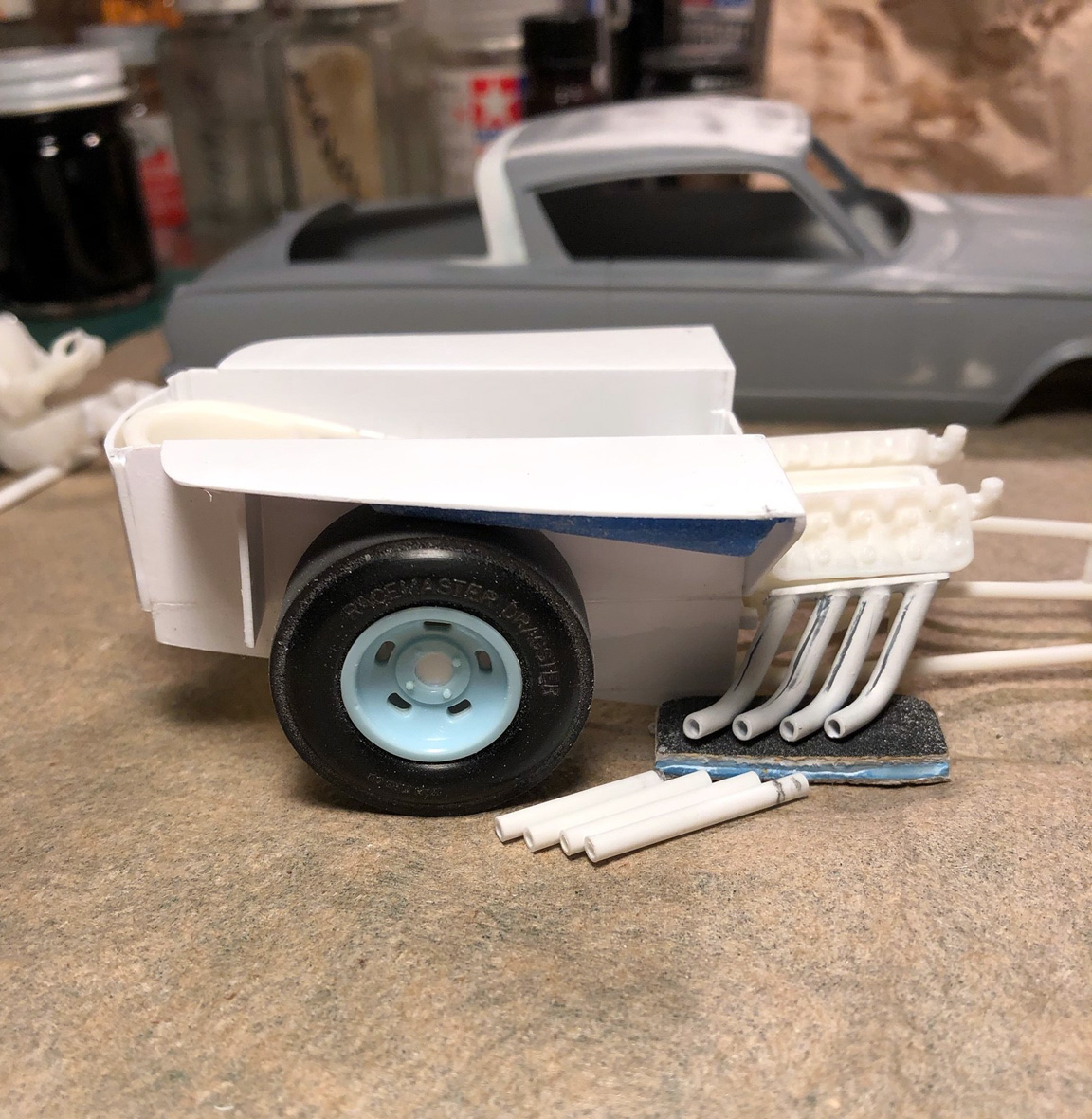 Headers are from the Revell Miss Deal and hollow round tube extensions are added for extra length.