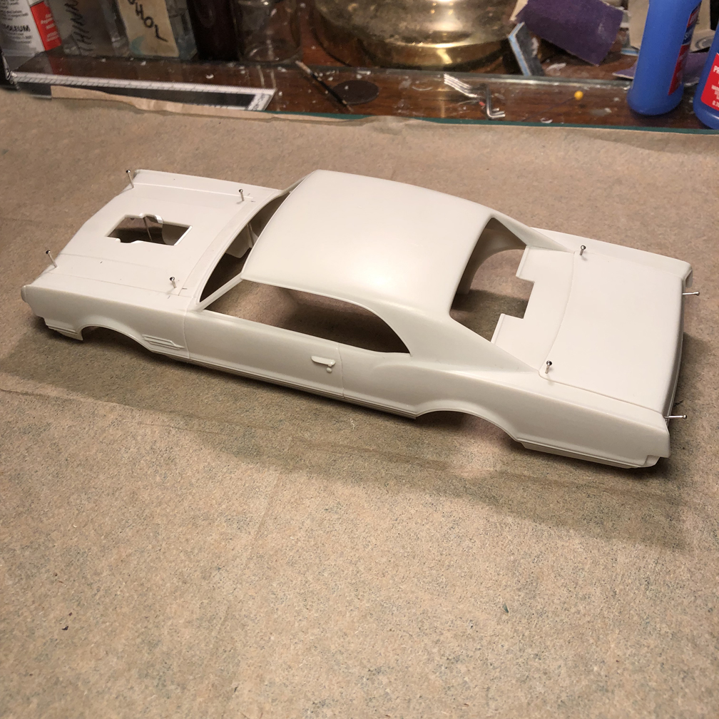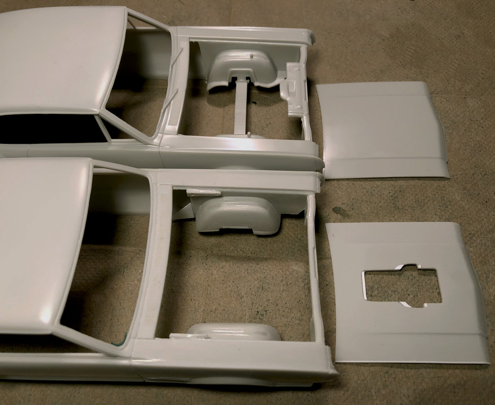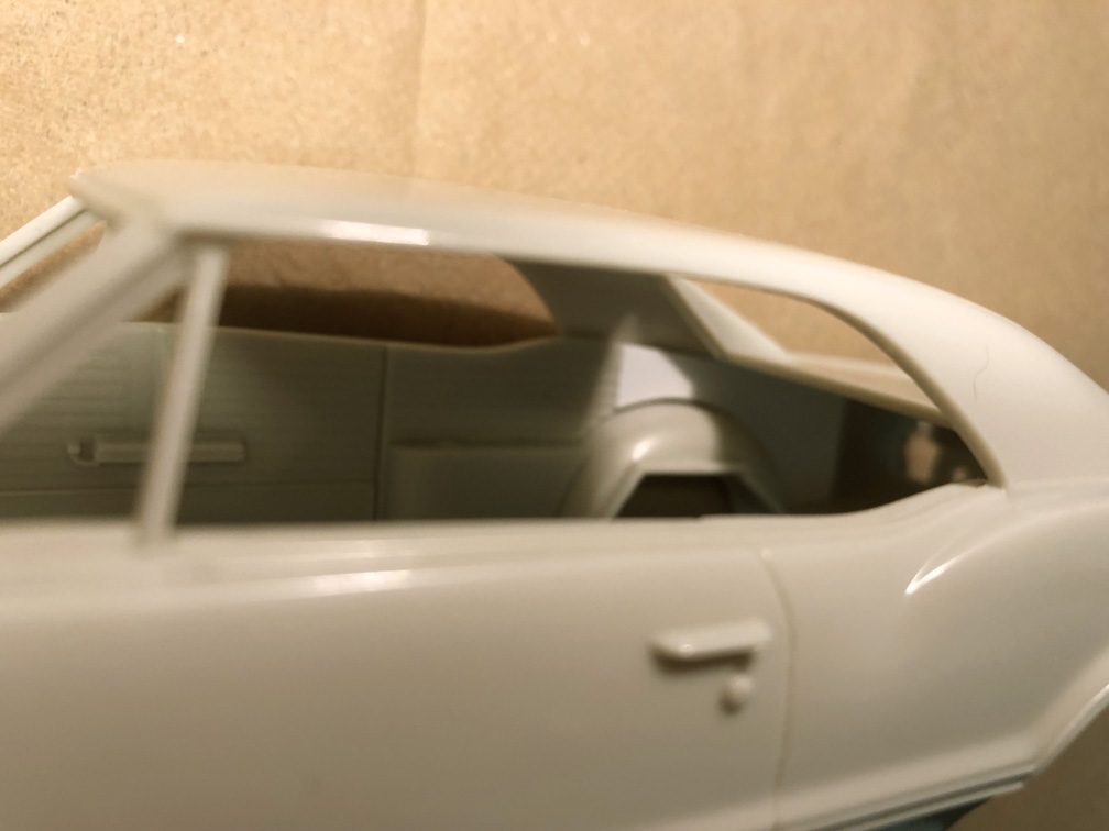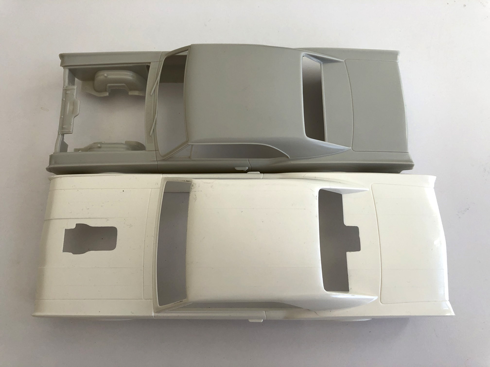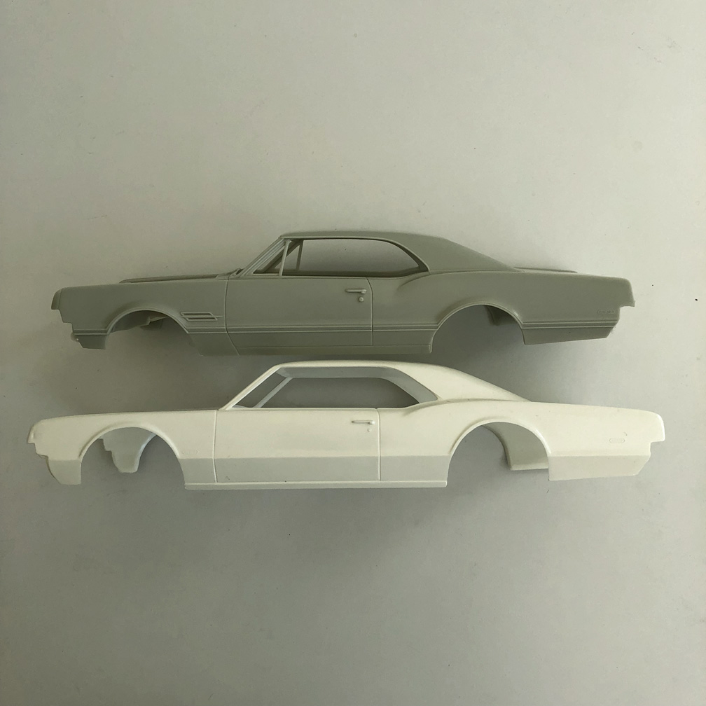 You can really see the difference between the AMT 1/25 1966 Olds body (gray) and the Monogram 1/24 1967 Olds altered body (white).