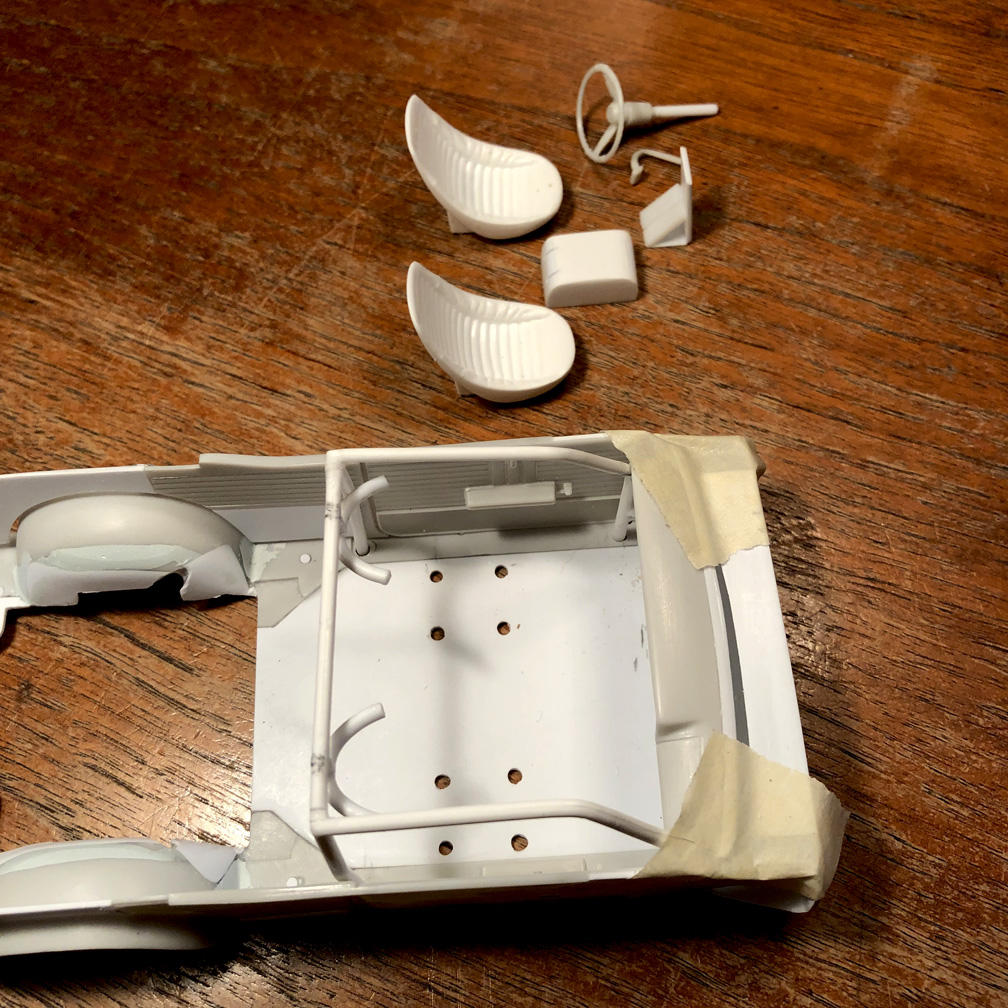 - Hood hinge supports were made from the #40 rear end pieces from the AMT '66 Olds kit.