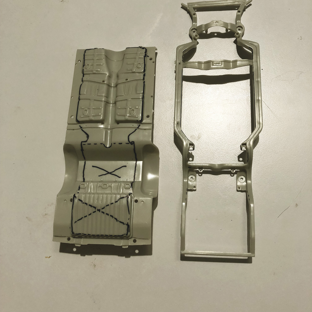 Here you can see all the cuts to remove unwanted sections from a Monogram Hurst Hairy Olds 1/24 chassis.