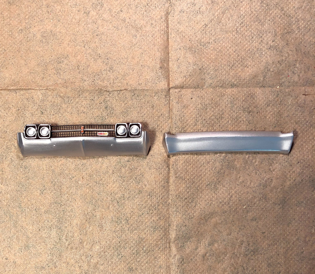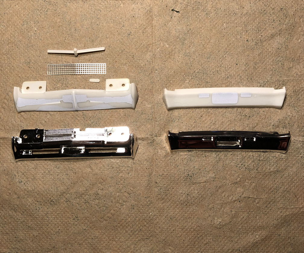 The bumpers were de-chromed using Easy-Off. Holes on the front bumper were filled in with .020 x .060 plastic strip.