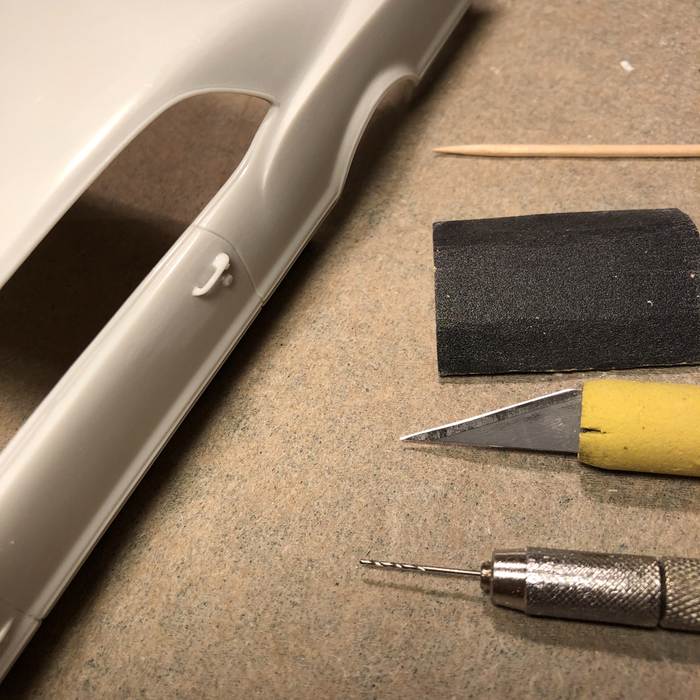 Getting back to this project, I drilled through the trunk support and added some plastic strip to the hood area.