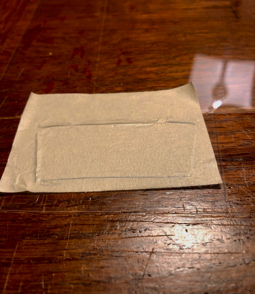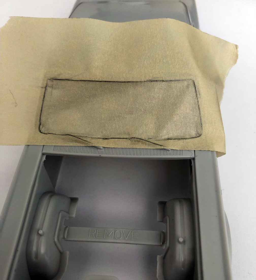 Photo 4. Put traced masking tape on a sheet of 0.10" clear plastic and cut along pencil line.