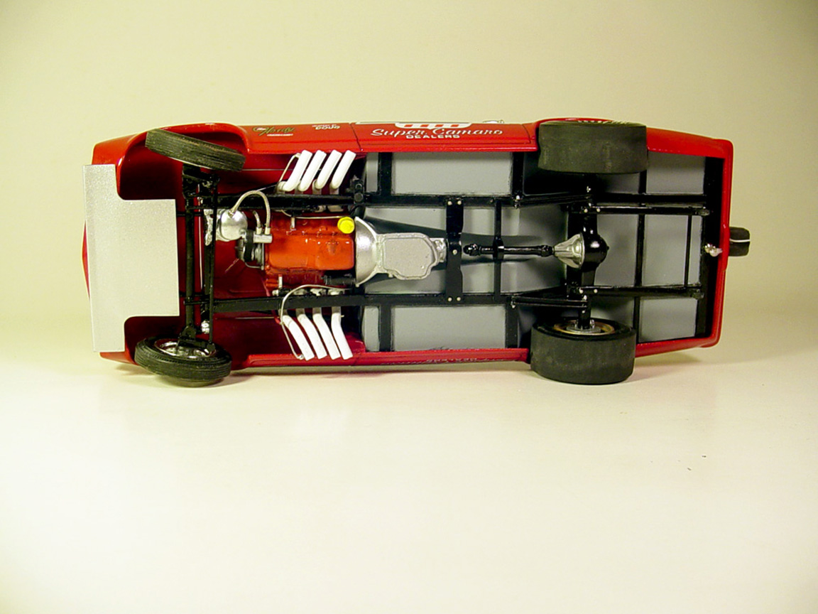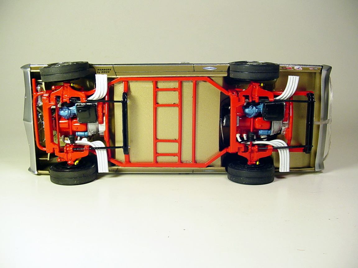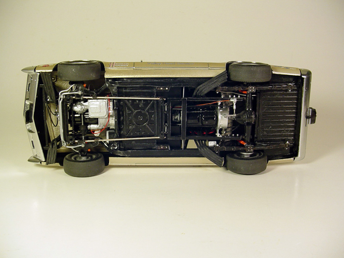 fuel lines, linkage, water lines, large chin spoiler, headers (made from solder), hubs on rear mag wheels, gas pedal base,