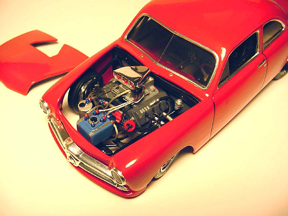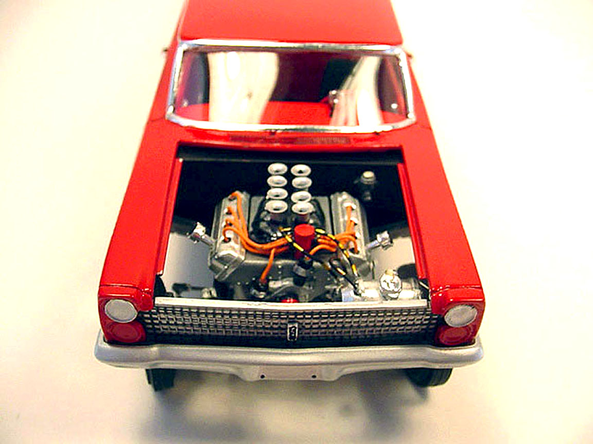 Mercury grill emblem (cut from AMT '66 Ford Galaxie grill), fuel injection manifold, 4" injection stacks, dash board,