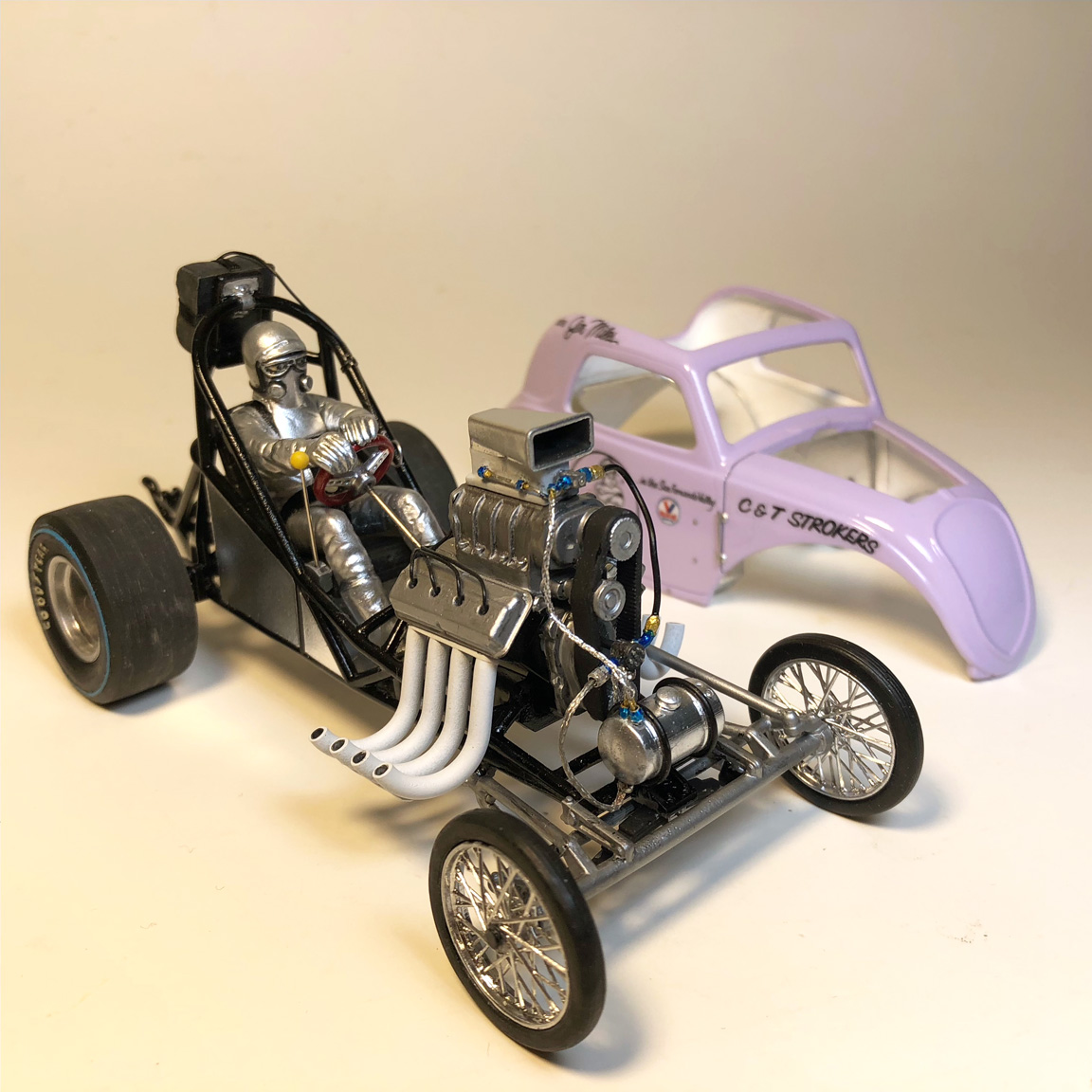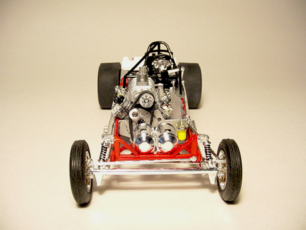 Scratch built features: Firewall, front frame clip, Hemi Hilborn Injection Manifold