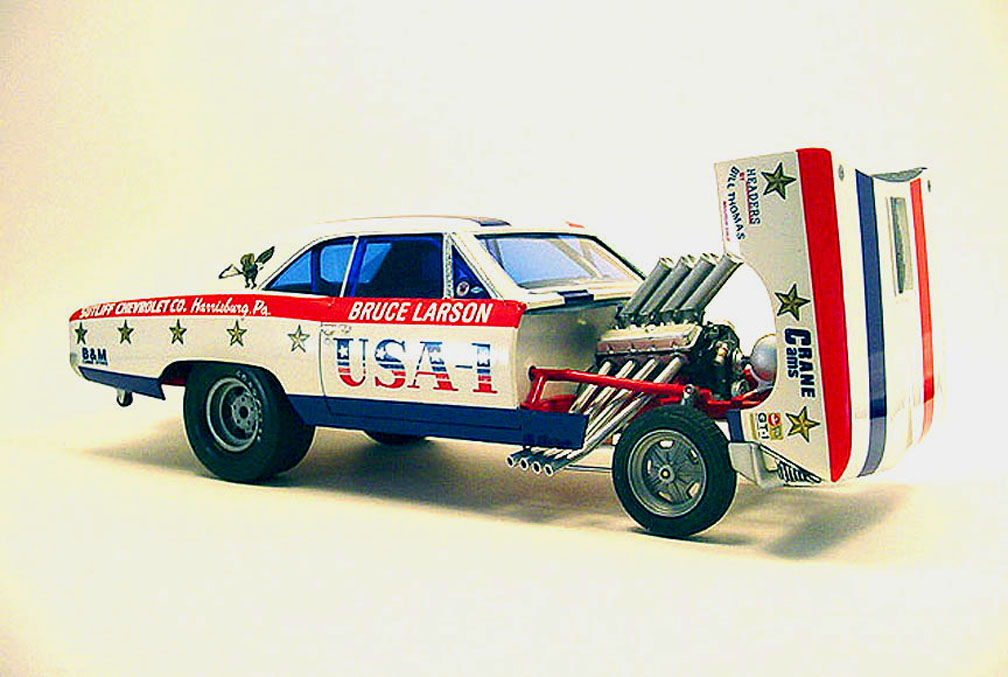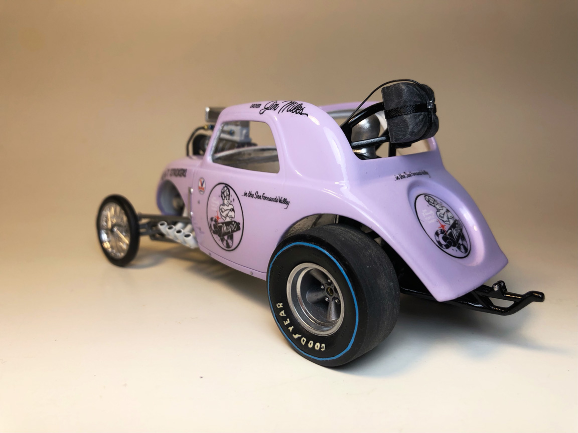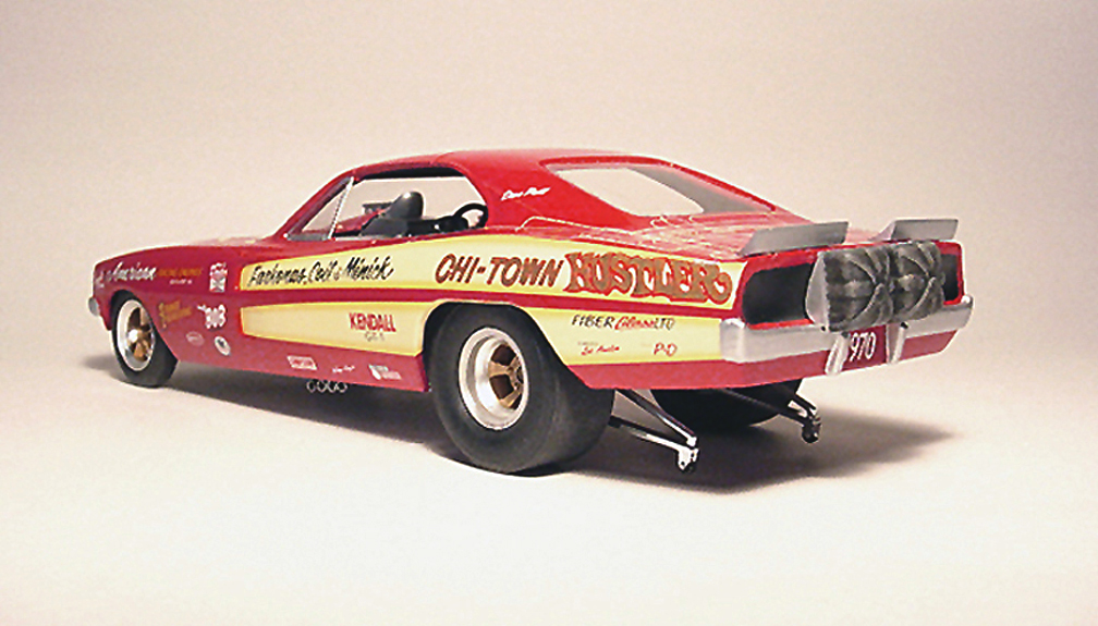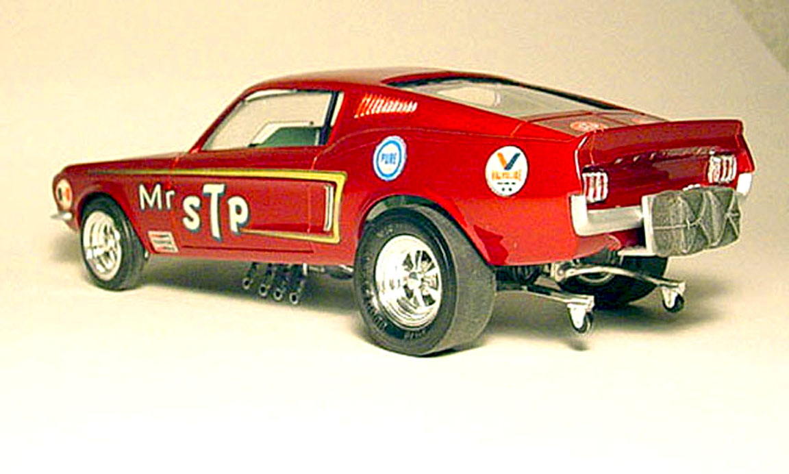 Slicks were swapped out, headers from MPC Malco Mustang Gasser were cut separately and flipped around.