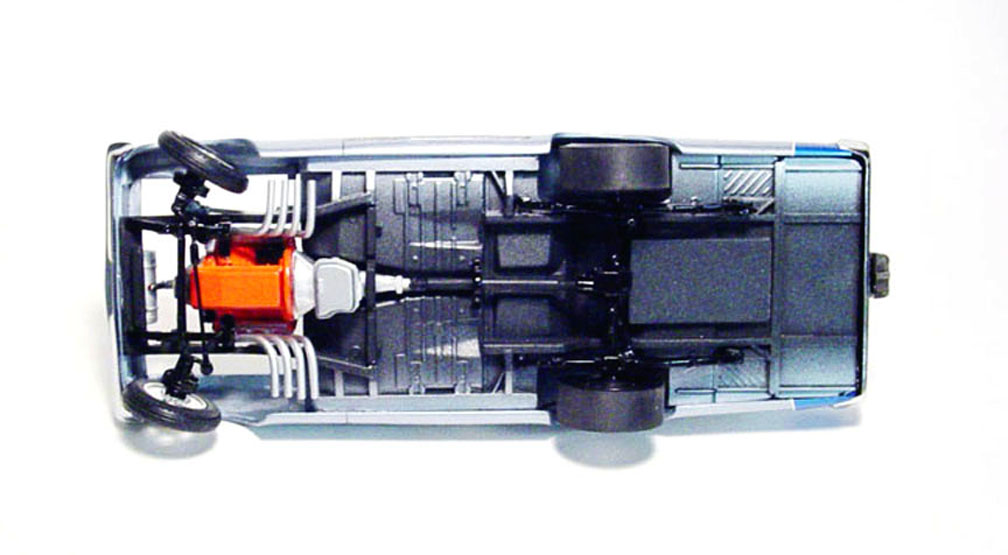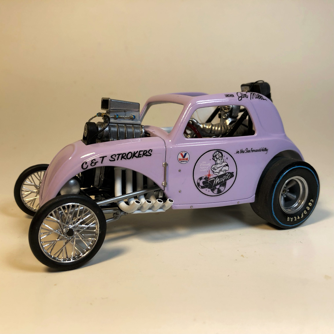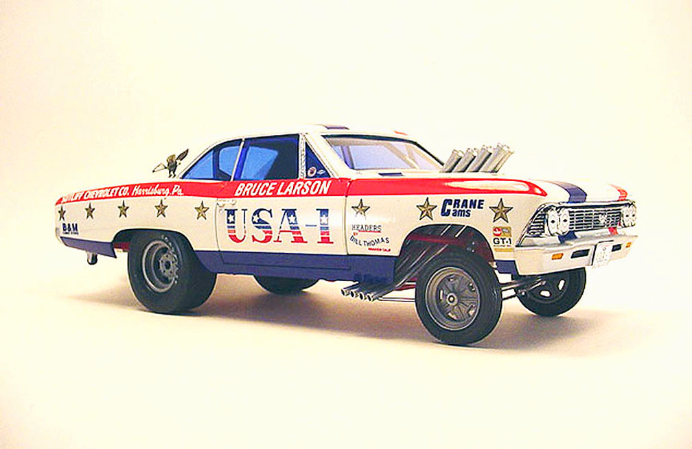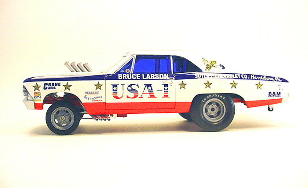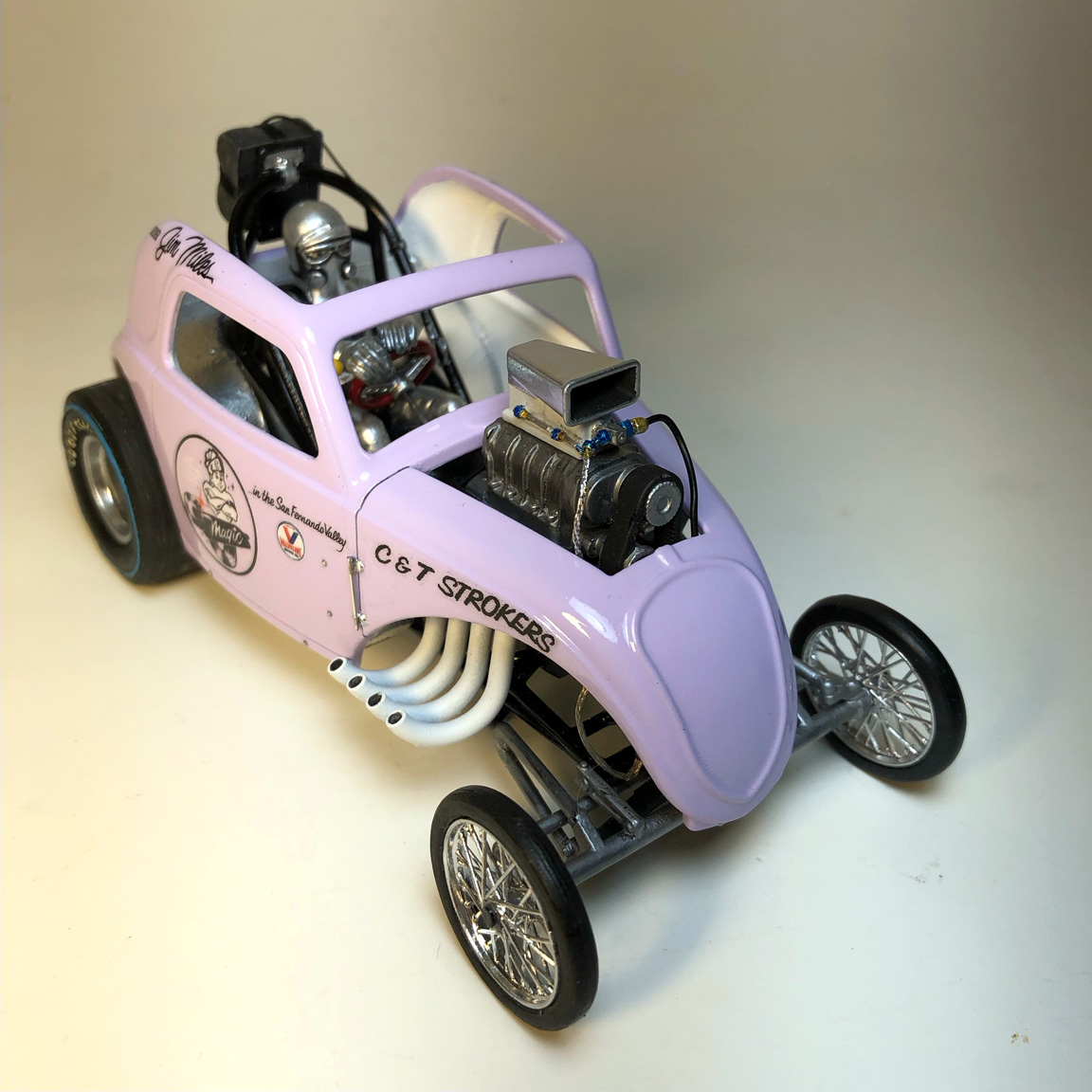 Slicks were swapped out, headers from MPC Malco Mustang Gasser were cut separately and flipped around.