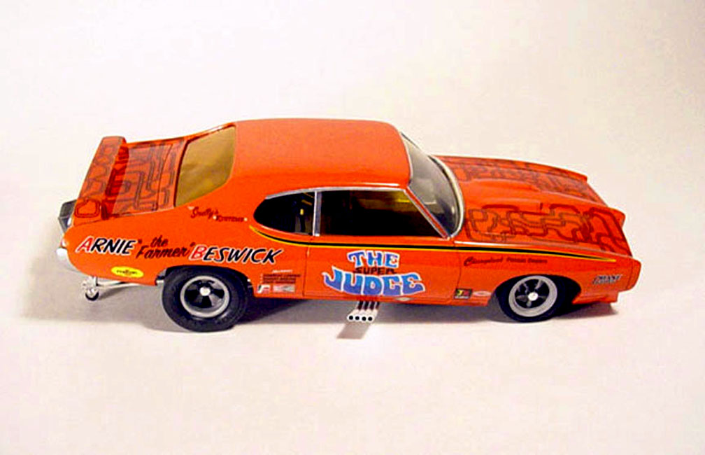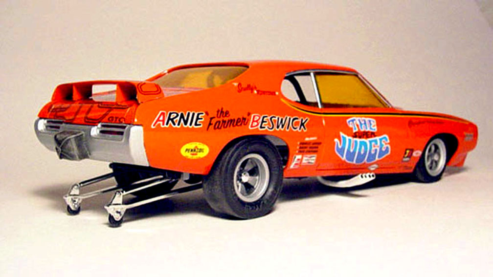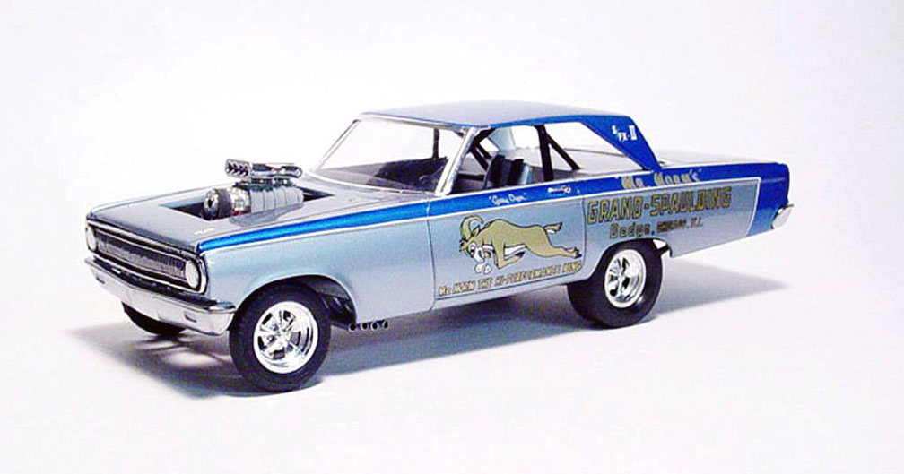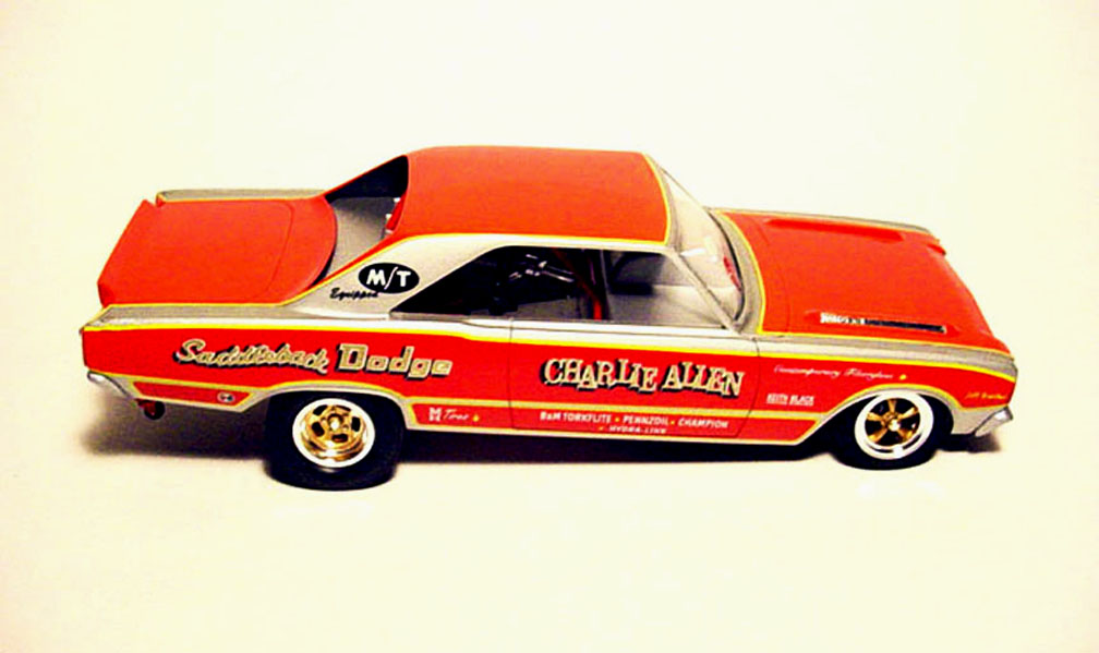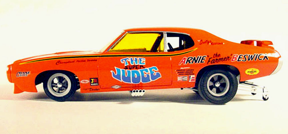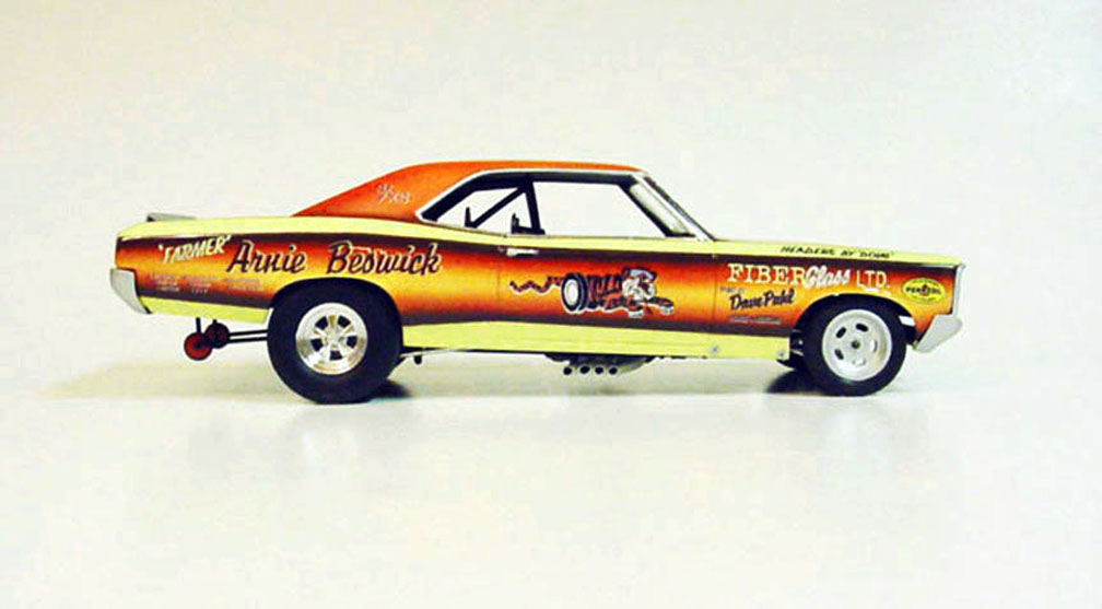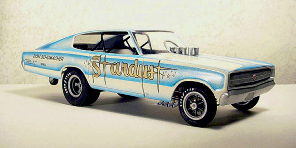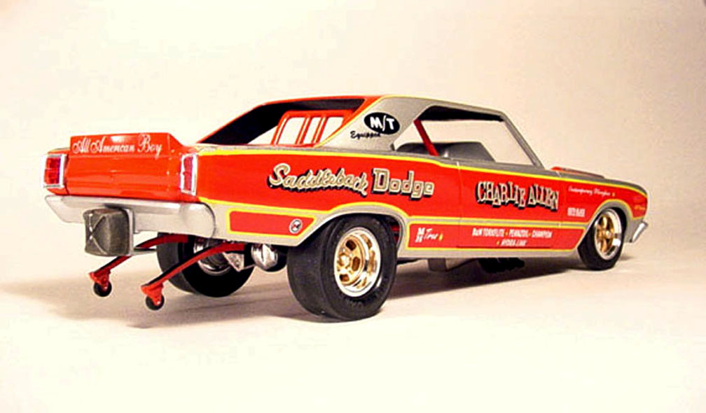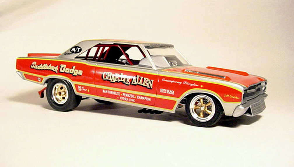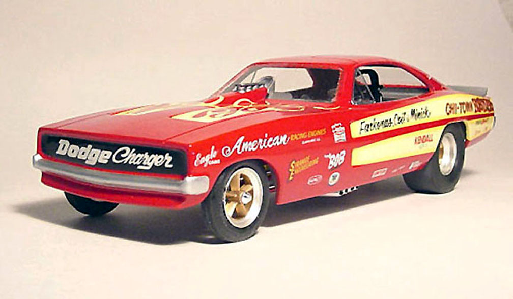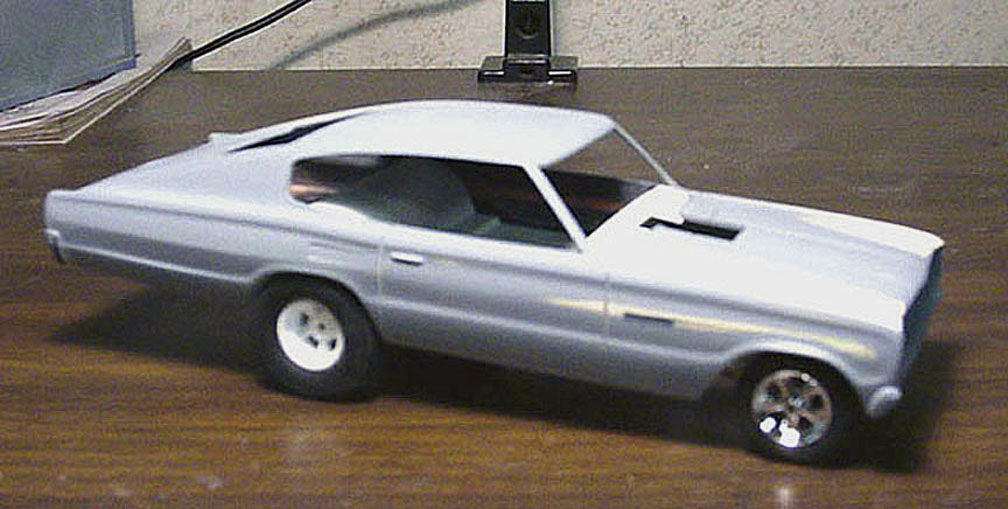 Starting with a Polar Lights '69 Charger Funny Car, the hood had a scratch built hood scoop added to an off set.