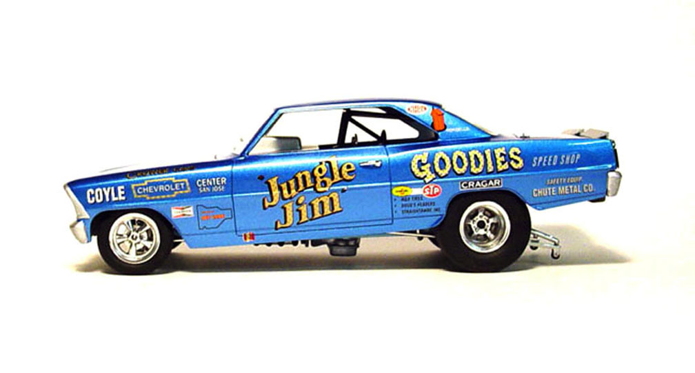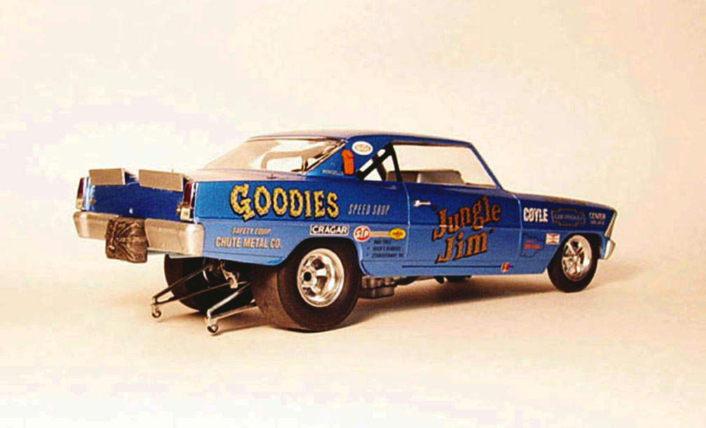 A Polar Lights F/C chassis was shortened 6" to fit new '67 Nova body. Rear Air Foils.
