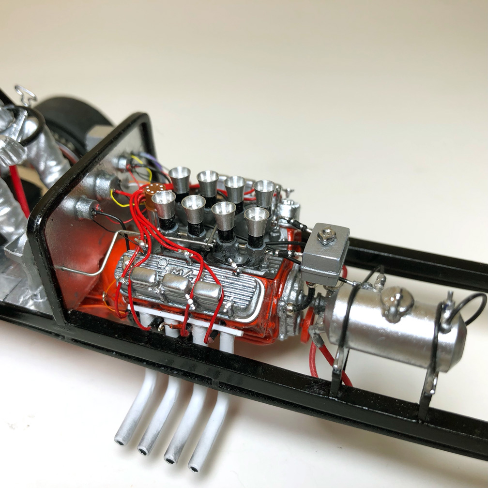 Stacks are shown on a Revell Tommy Ivo "Showboat" Dragster Nail Head Engine.